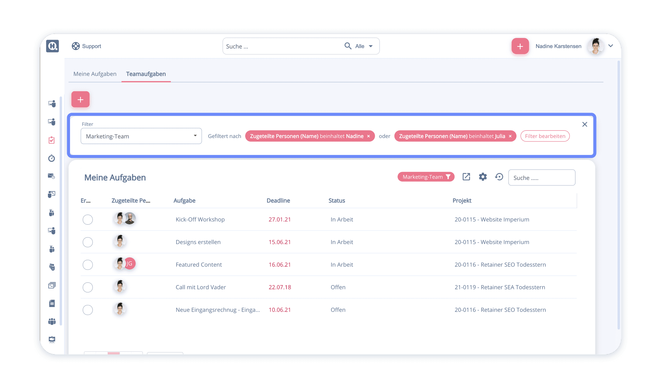 Ein Beispiel: Ihr leitet das Marketing-Team in eurer Agentur, müsst also über den Status der Aufgaben des Teams immer up-to-date sein. Anstatt in jedes einzelne Projekt klicken zu müssen, baut ihr euch einfach über die Filterfunktion eine Ansicht, um alle To-Dos zu sehen, an denen eure Teammitglieder im Marketing gerade arbeiten.