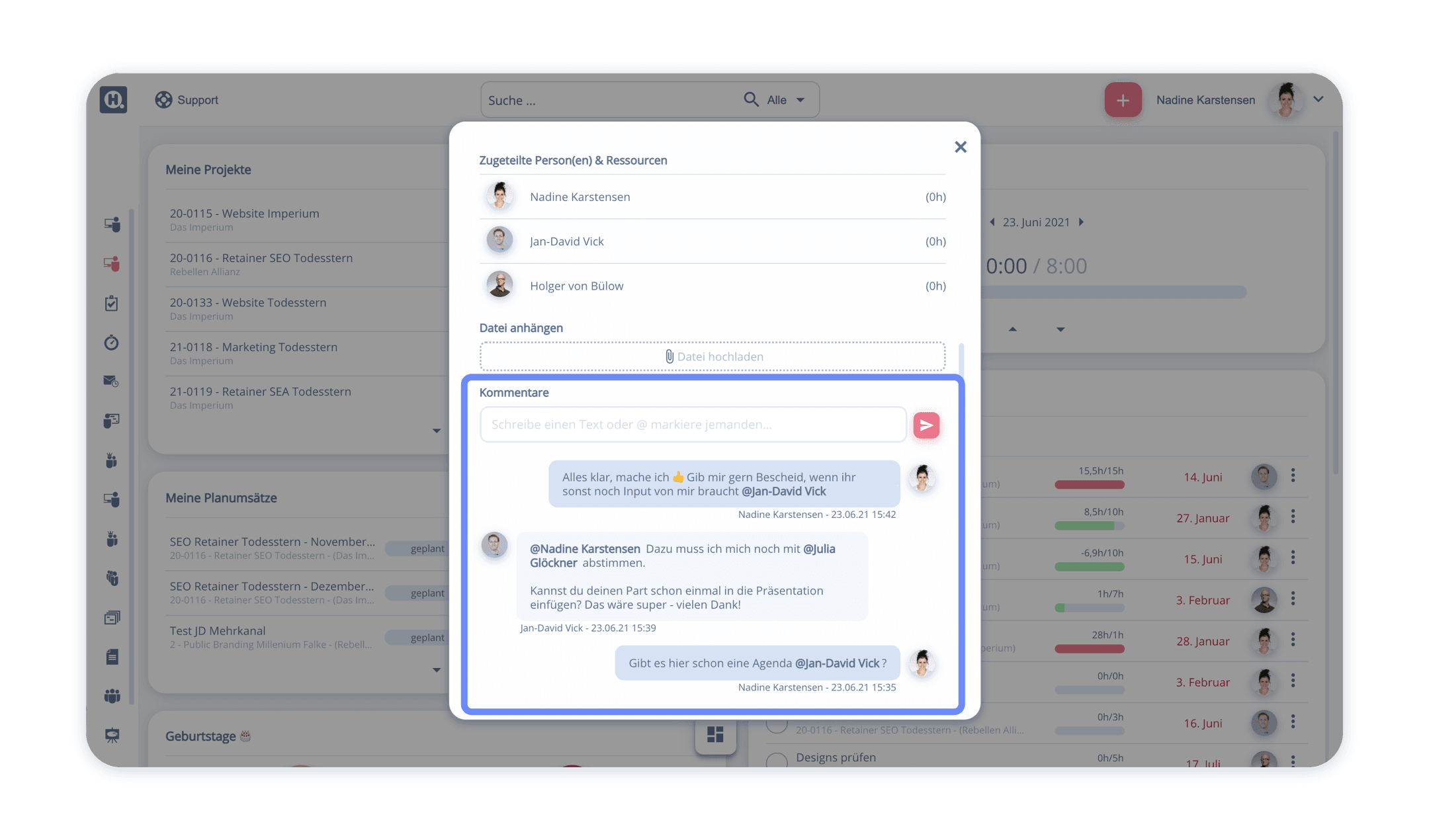 Über die Kommentarfunktion könnt ihr schnell und einfach das Wer macht was genau? absprechen, sodass die Verantwortlichen für alle sofort klar und transparent sind. So einfach war das Teammanagement in helloHQ noch nie!