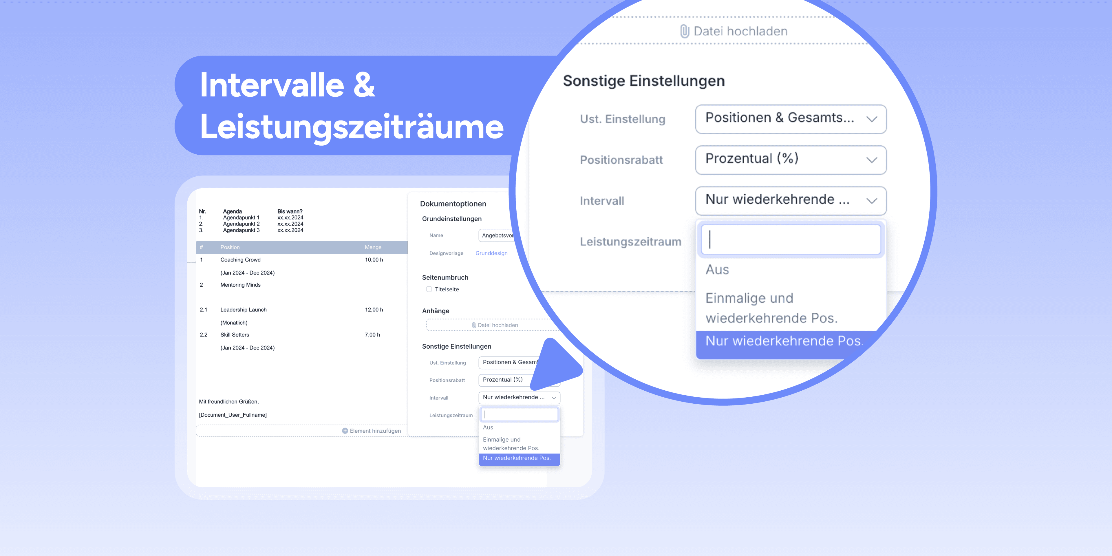 Auf den Wunsch unserer helloHQ-User hin ist es nun möglich, Angaben zu Leistungszeiträumen und Intervallen auf Angeboten und Auftragsbestätigungen auszublenden. Du bietest in einem Angebot sowohl einmalige als auch wiederkehrende Positionen an? Das neue helloHQ-Update ermöglicht es dir, den Leistungszeitraum und/oder das Intervall nun nur bei wiederkehrenden Positionen anzeigen zu lassen oder komplett auszublenden, was deine Finanzdokumente übersichtlicher und geordneter macht. Die Einstellung dazu kann in den Dokumentvorlagen vorgenommen werden.