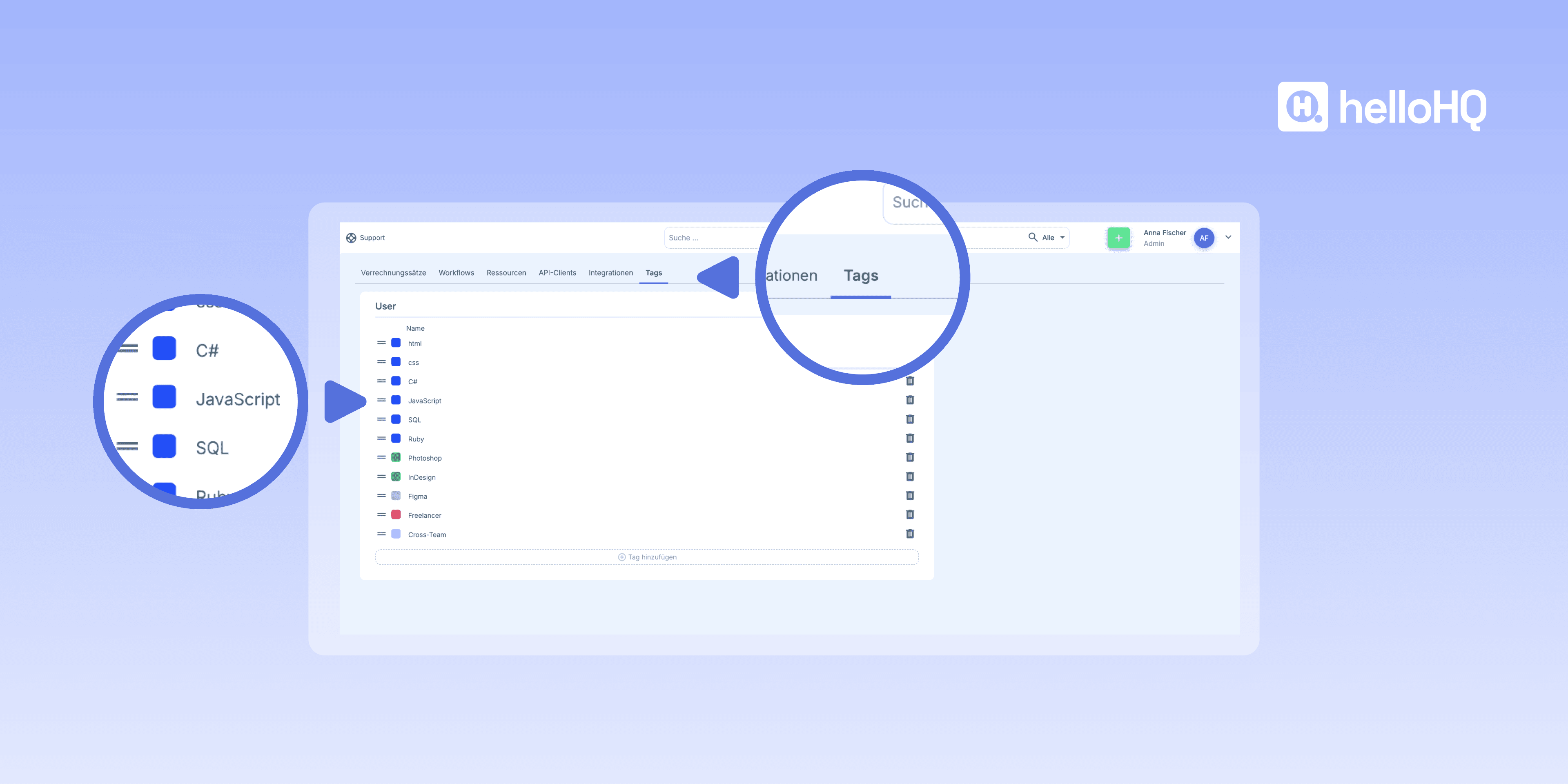 - als Vorbereitung für die zukünftige Ressourcenplanung nach Tags (z. B. „UX“, „Englisch“, „React“)