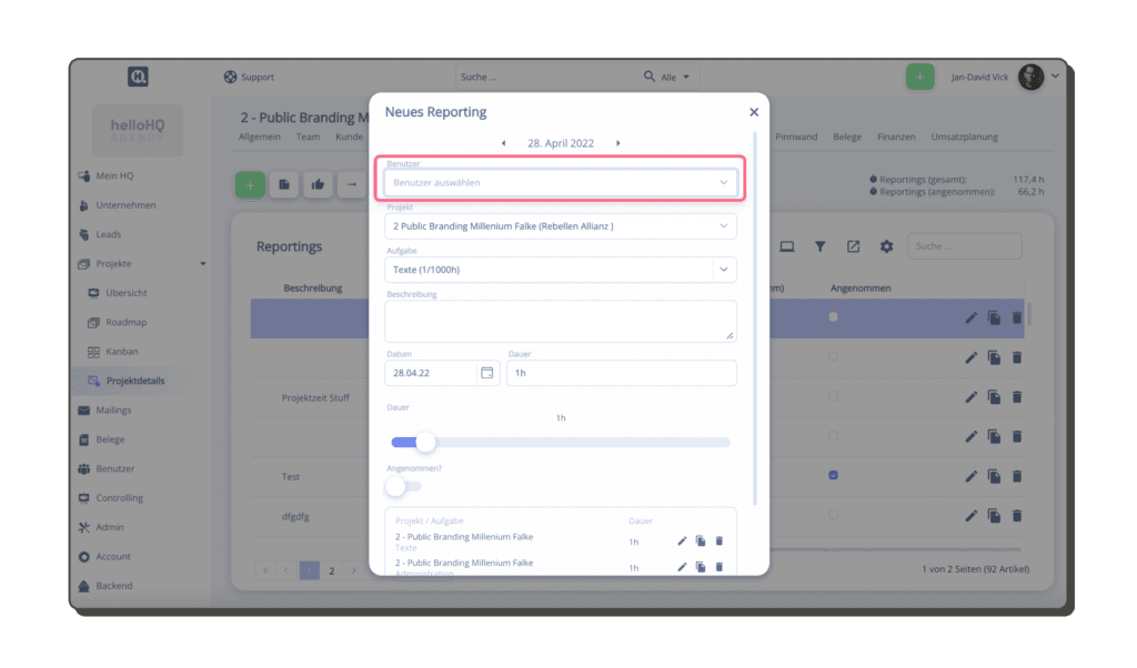 In den Projektreportings werden neben dem Projekt, der Aufgabe und dem Datum auch die bearbeitende Person und die Dauer der Bearbeitungszeit dokumentiert. Seit dem neuen Update könnt ihr beim Kopieren eines Reportings den Benutzer sowie die Bearbeitungszeit anpassen.