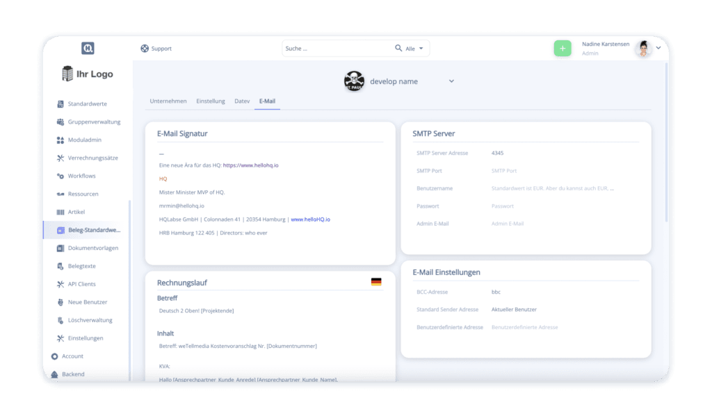 In helloHQ könnt ihr eure Belege per Email versenden. Die Einstellungen dazu könnt ihr nun direkt in den Beleg-Standardwerten steuern. Hier lässt sich unter Anderem der SMTP-Server pflegen, welcher zuvor nur über die Admin-Einstellungen angepasst werden konnte. Außerdem könnt ihr Texte für den Rechnungslauf mit unserem neuen Editor einfach anpassen und nach euren Wünschen designen.